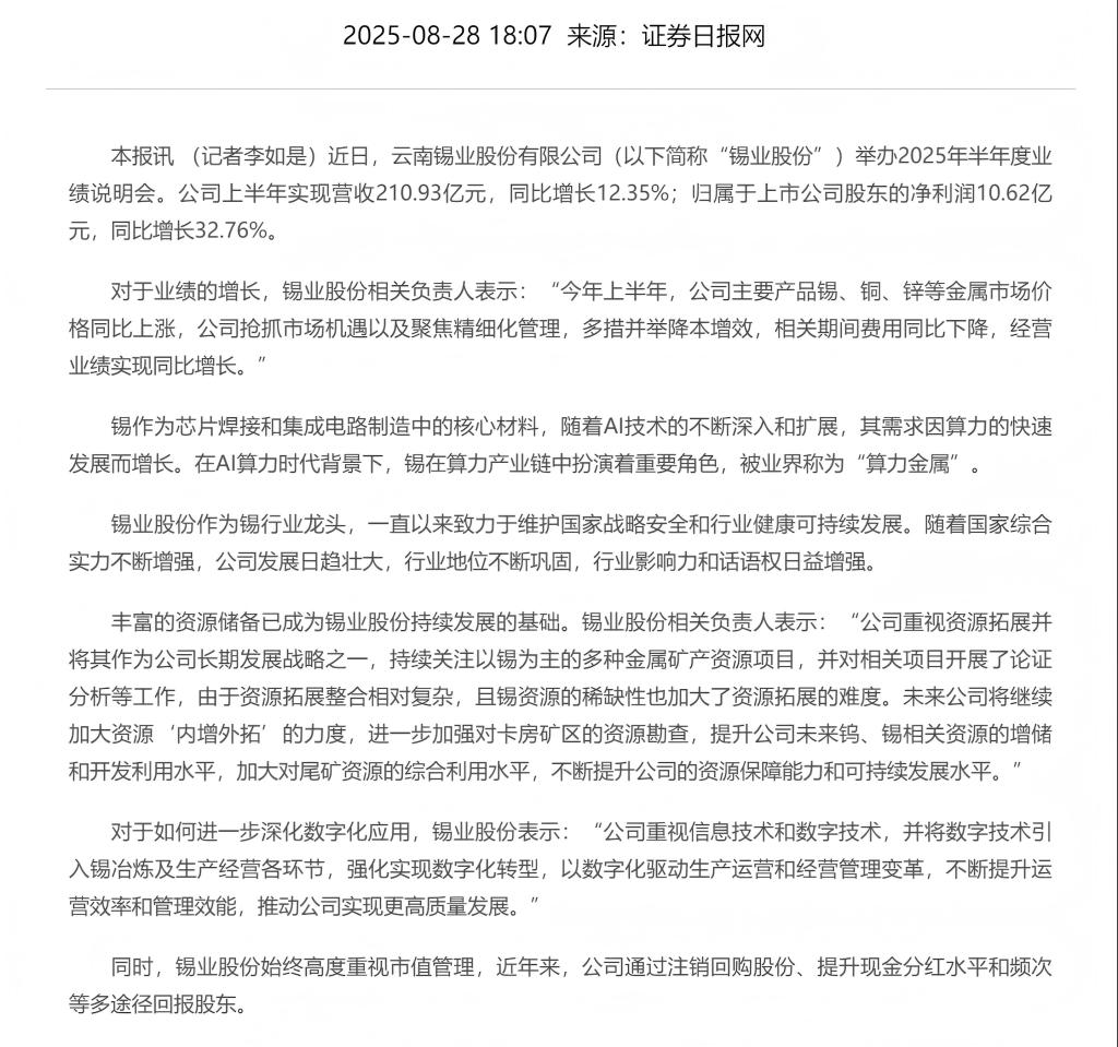 证券日报网:锡业股份2025半年度业绩说明会——提升资源保障能力 多途径回报股东