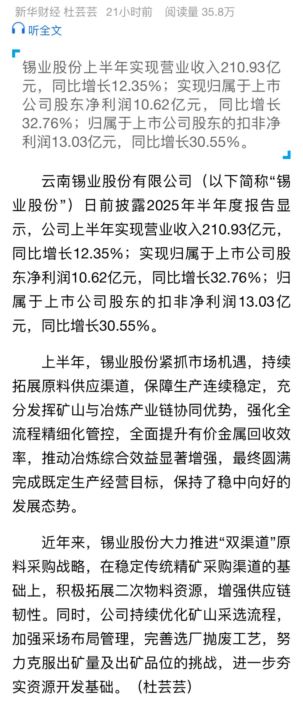 新华财经:锡业股份上半年归母净利润同比增长32.76%