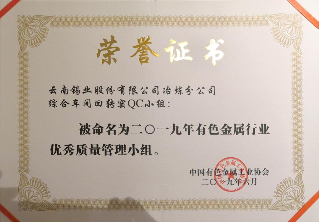 7月10日,在2019年度有色金属行业全国优秀质量管理小组及全国质量信得过班组评审会上,冶炼分公司综合车间回转窑QC小组荣获“全国优秀质量管理小组”荣誉称号,其QC成果荣获“囯优”奖项,该成果也是云南省有色金属行业唯一一个获得“国优”奖项的QC成果。