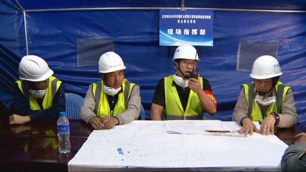 此次演练方式采取实地演练,即在实际环境下组织专项实兵演练,并采取单频观摩的方式进行观摩。“井下发生冒顶了,井下发生冒顶了,大家快撤,大家快撤……”井下值班长大声叫到。演练模拟大屯锡矿1360坑450米探矿平巷掘进迎头外50米左右突然发生巷道顶板冒顶坍塌,并将巷道内的风管、水管、电话线、供电线路砸断,巷道被垮落的支护、岩石堵塞,长度约10米左右,通过查看出入井记录和人员定位系统,核实单班入井人员共26人,安全出井23人,3名人员被困。大屯锡矿逐级上报,州政府应急办接报后遂启动《红河州非煤矿山生产安全事故应急预案》,同时责成各相关部门、单位和救援队赶赴事故现场展开救援。包括现场指挥、抢险救援、医疗卫生、物资保障在内的9个工作组经短暂集结了解险情后,分别领命向事故地点进发。与此同时,现场指挥部指挥长、个旧市副市长邹文鸿等领导,前往现场指挥部指挥救援工作的开展。