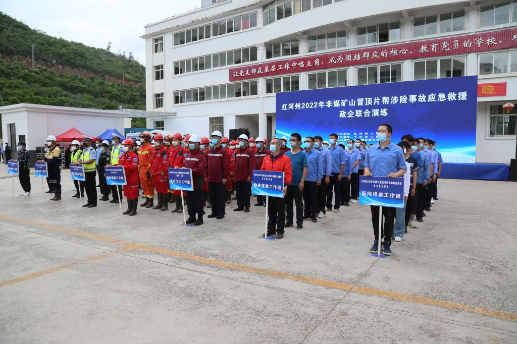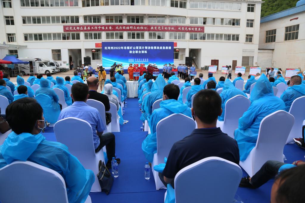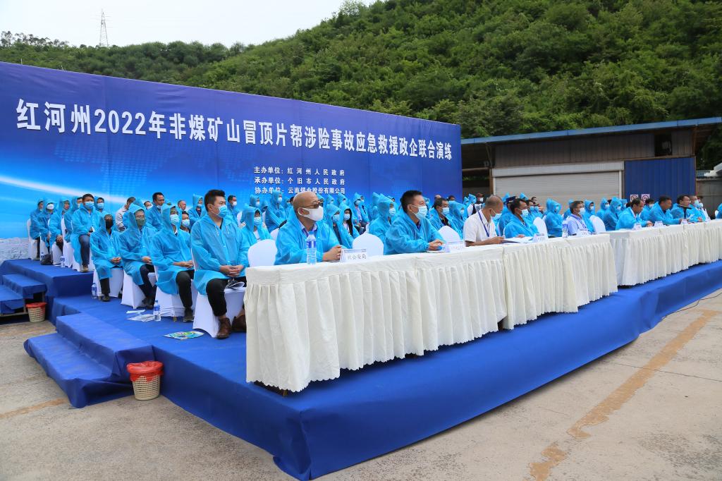 6月23日,由红河州人民政府主办、个旧市人民政府承办、云南锡业股份有限公司协办的红河州2022年非煤矿山冒顶片帮涉险事故应急救援政企联合演练在大屯锡矿举行。认真学习贯彻落实习近平总书记关于安全生产重要论述,推动各级应急管理责任落实,压实安全生产责任,切实提高红河州非煤矿山事故应急救援能力。红河州人民政府副秘书长杨克平,红河州应急管理局局长张锰,锡业股份党委副书记、董事长、总经理刘路坷,锡业股份党委委员、副总经理王建伟,锡业股份党委委员、大屯锡矿党委书记、经理王寿安等出席演练活动。