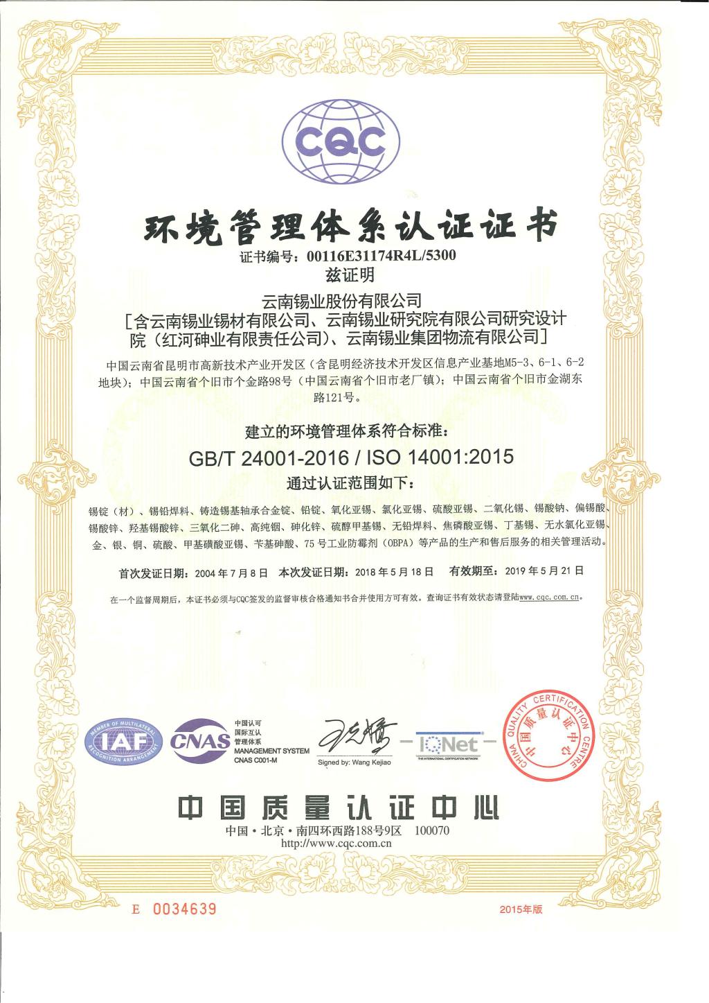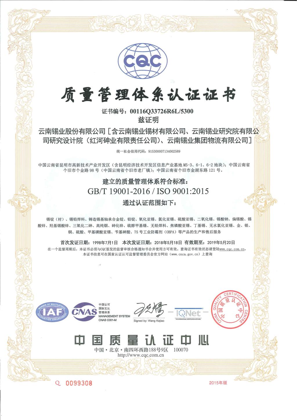 2017年,锡业股份根据国家新发布的质量管理体系(GB/T 19001-2016/ISO 9001:2015)、环境管理体系(GB/T 24001-2016/ISO 14001:2015)标准要求,特邀中国质量认证中心CQC云南评审中心专家到公司,对体系覆盖单位的内审员、管理人员进行质量、环境管理体系新版标准及职业健康安全管理体系标准宣贯培训。随后,公司组织有关部门、单位根据新版标准要求识别公司的主要过程,建立高效简练的管理流程,针对可能存在的风险、机遇及后果,制定相应的控制措施以及量化的过程控制绩效指标,在中心老师的指导下,修改旧版文件形成新版管理体系文件发布实施。经公司内部试运行、内部审核及管理评审,2018年4月初通过中国质量认证中心CQC云南评审中心的换版认证现场审核及监督审核。