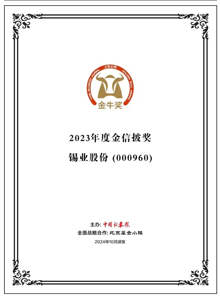 10月24日,中国证券报正式揭晓了2023年上市公司金牛奖榜单,锡业股份(000960)荣获“2023年度金信披奖”。从评价结果统计来看,入围参选样本的4208家A股上市公司中仅有不超过450家获奖,占入围上市公司总数不到11%。“2023年度金信披奖”评价重点考虑上市公司的信息披露质量和效率。评选组委会根据上市公司年报质量、审计情况、交易所信息披露考评等指标进行综合判断,并最终评选出在信息披露方面表现较为突出的上市公司。