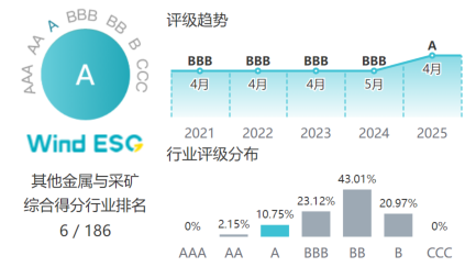 近日,万得(Wind)更新了2025年最新ESG评级结果,锡业股份Wind ESG评级由过去连续4年的BBB级首次提升至A级,在金属与采矿行业186家纳评上市公司中目前排名第6(AA和A评级分别仅占2%和10%,目前暂无AAA评级企业)。在此次评级中,锡业股份ESG综合得分为7.91分,在环境、社会、治理三个维度得分分别为6.95、8.27、5.77,均处于行业前列。