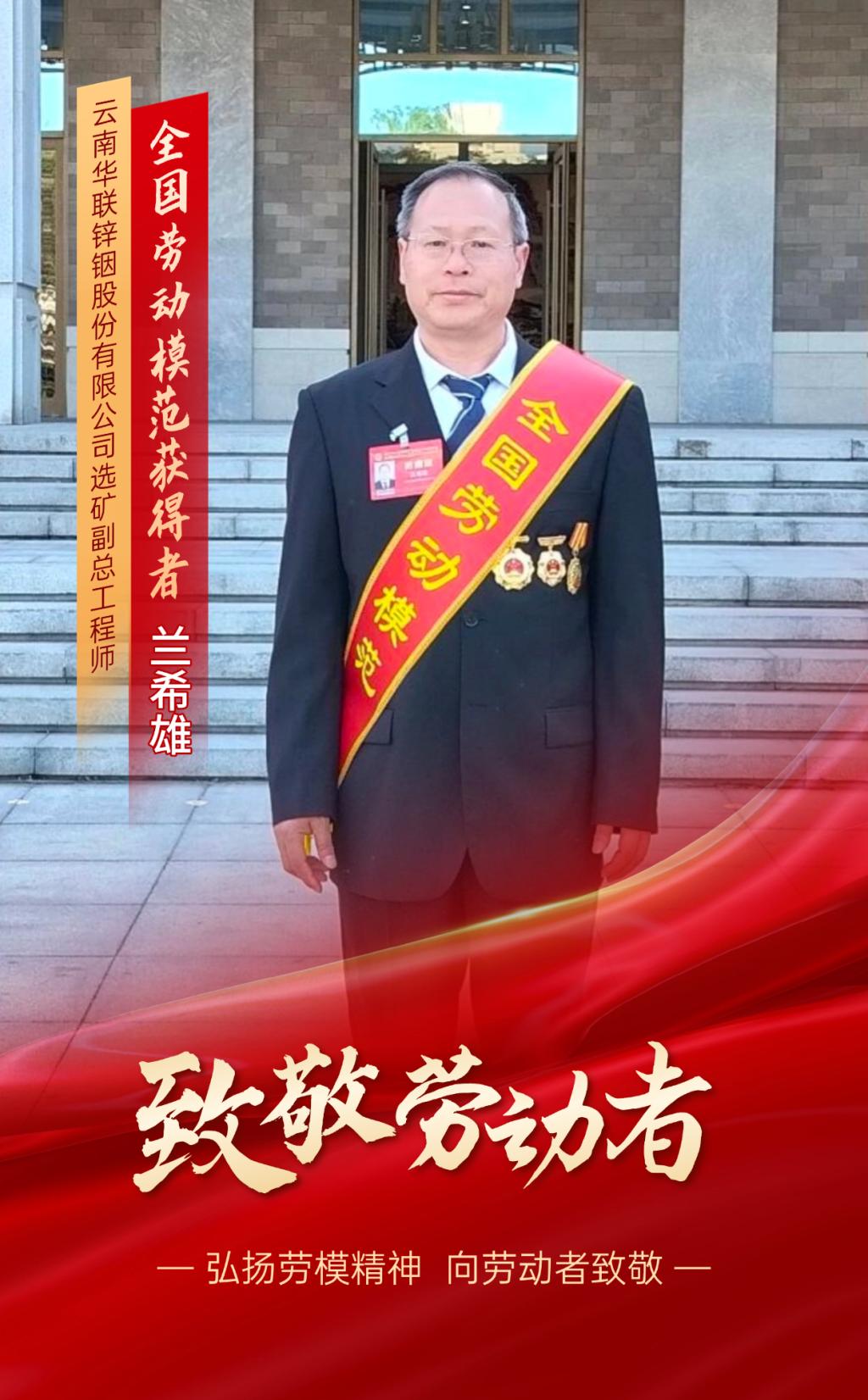 兰希雄,锡业股份所属华联锌铟公司选矿副总工程师,先后荣获“全国五一劳动奖章”“云南省劳动模范”“云南省产业技术领军人才”“云南省最美职工年度人物”等多项荣誉,享受国务院政府特殊津贴。