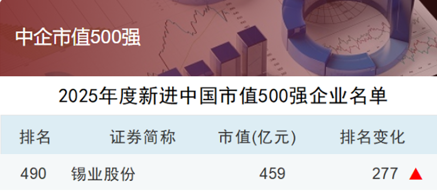 2026年1月1日,Wind 万得发布2025年度中国上市企业市值500强榜单,锡业股份(证券代码:000960)凭借459亿元市值(较年初涨幅超过102%)位列榜单第490名,较上一年度大幅提升277位,标志着公司作为全球锡行业龙头的市场地位与投资价值获资本市场高度认可。